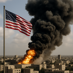 AI generated image of a US flag flying in the foreground with a low-rise Middle Eastern styled city in the background. An explosive fire with thick black smoke is rising in the middle